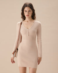 Bej Rengi V Yaka Vücuda Oturan Kazak Elbise