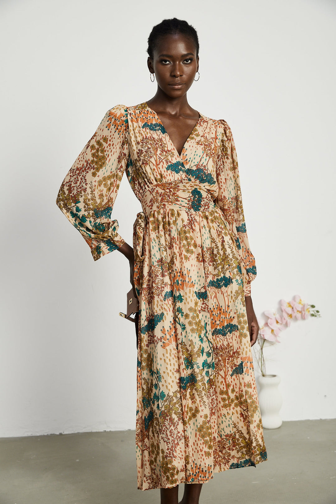 Capucine Çiçek Desenli Yırtmaçlı Midi Elbise