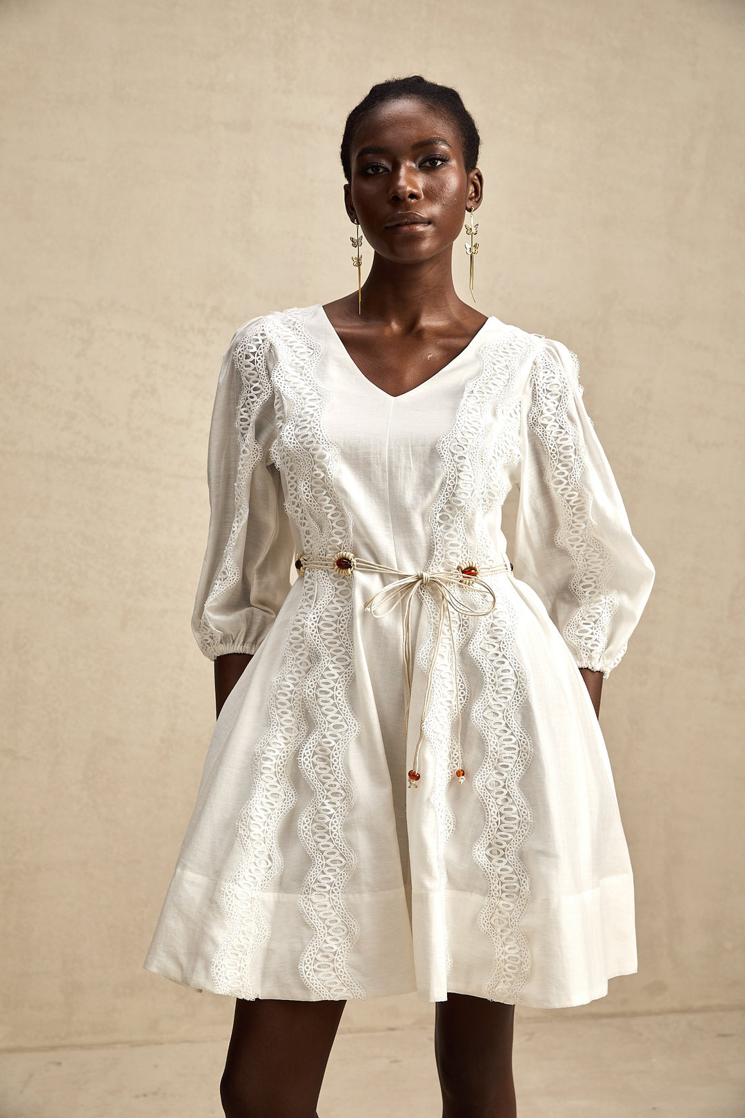 Colette Beyaz Dantel Detaylı Belden Bağlamalı Midi Elbise