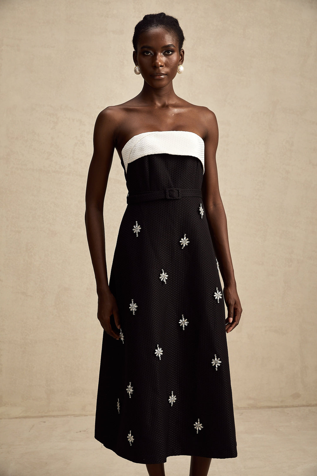 Morgane Kontrast Renk İşlemeli Kuşaklı Midi Elbise