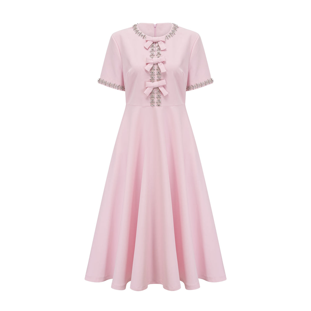 Esther Pembe Fiyonk Detaylı Kısa Kollu Kristal Midi Elbise