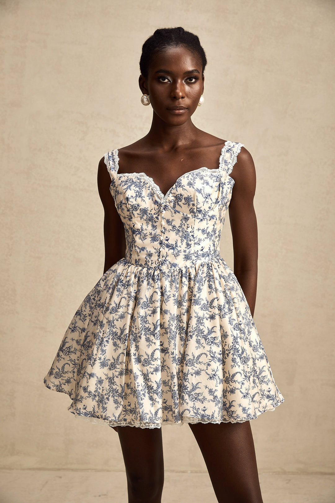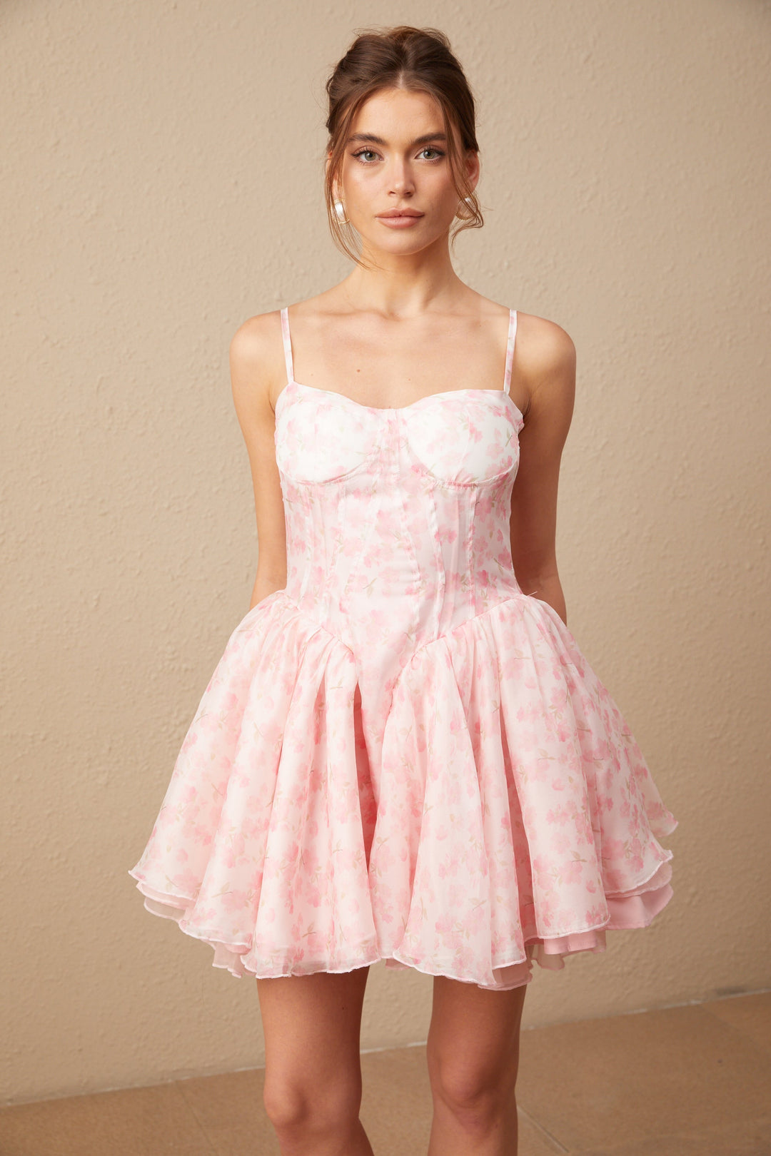 Therese Pembe Çiçek Desenli Kabarık Mini Elbise