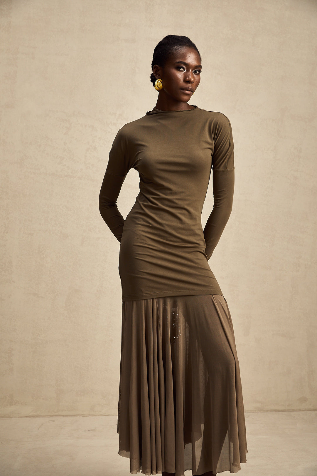 Nina Rayon Kahverengi Tül Bluz Ve Etek Uyumlu Takım