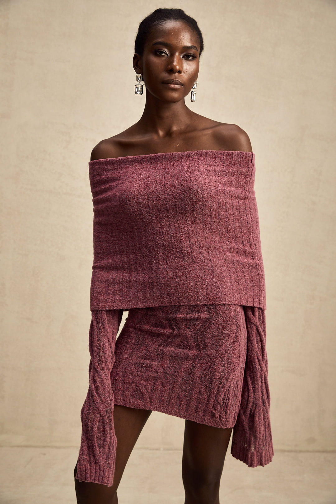 Aya Pembe Uzun Kollu Yün Tığ İşi Örgü Mini Elbise
