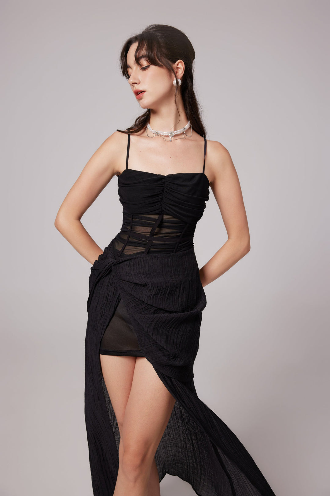 Guinevere Siyah Transparan Asimetrik Midi Elbise