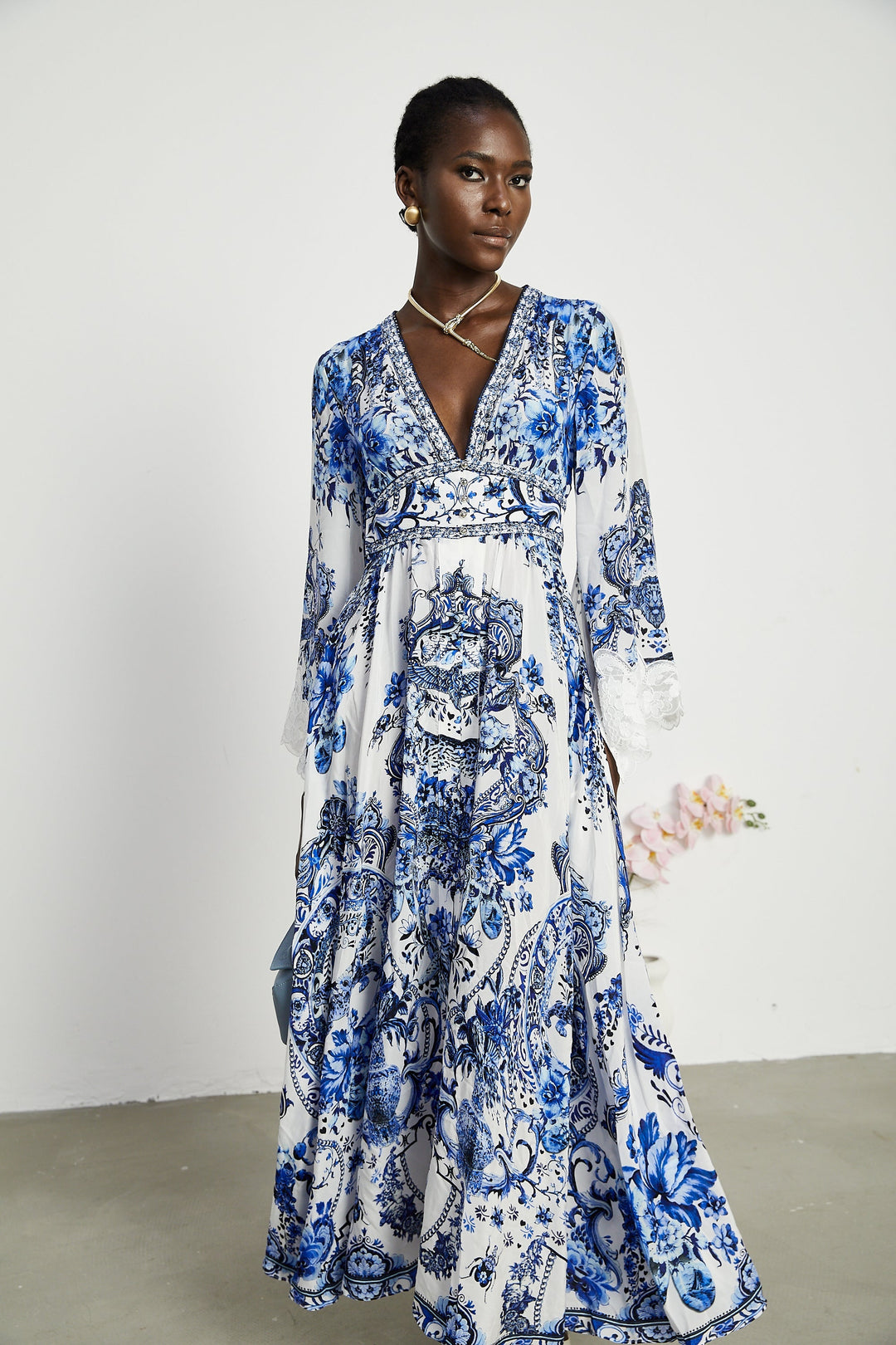 Rosalee İpek Desenli Dantel Detaylı Maxi Elbise