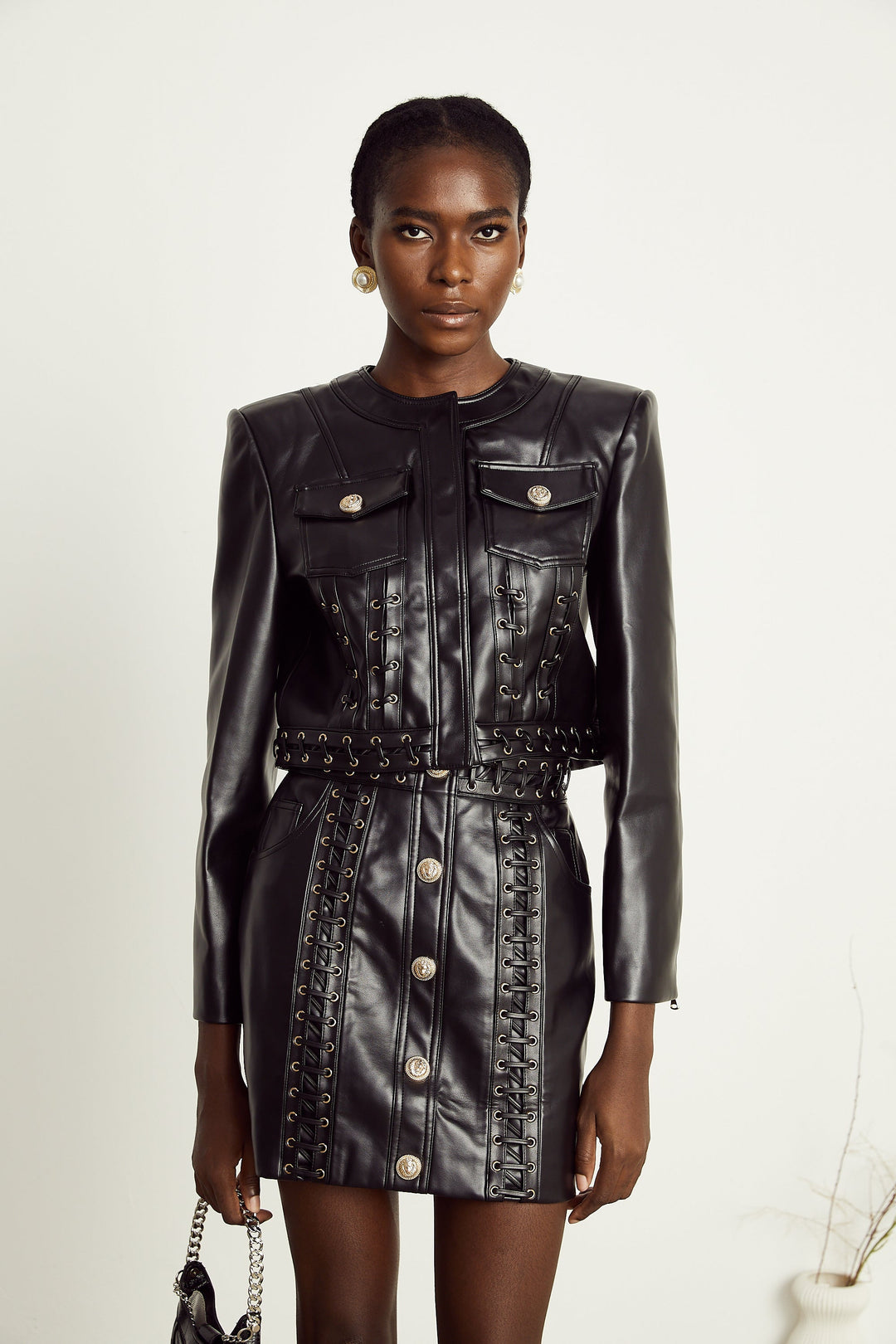 Daphné Kuşgözü Detaylı Deri Ceket & Etek Kombin Seti
