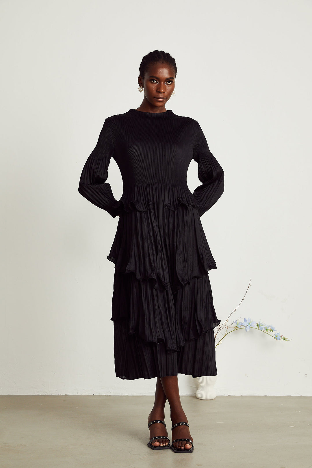 Brianna Siyah Katmanlı Pileli Midi Elbise