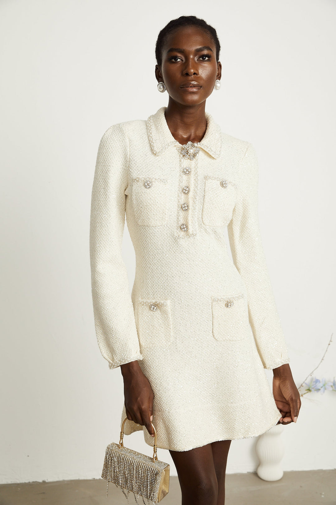 Auréliey Beyaz Pullu Tüvit Mini Elbise