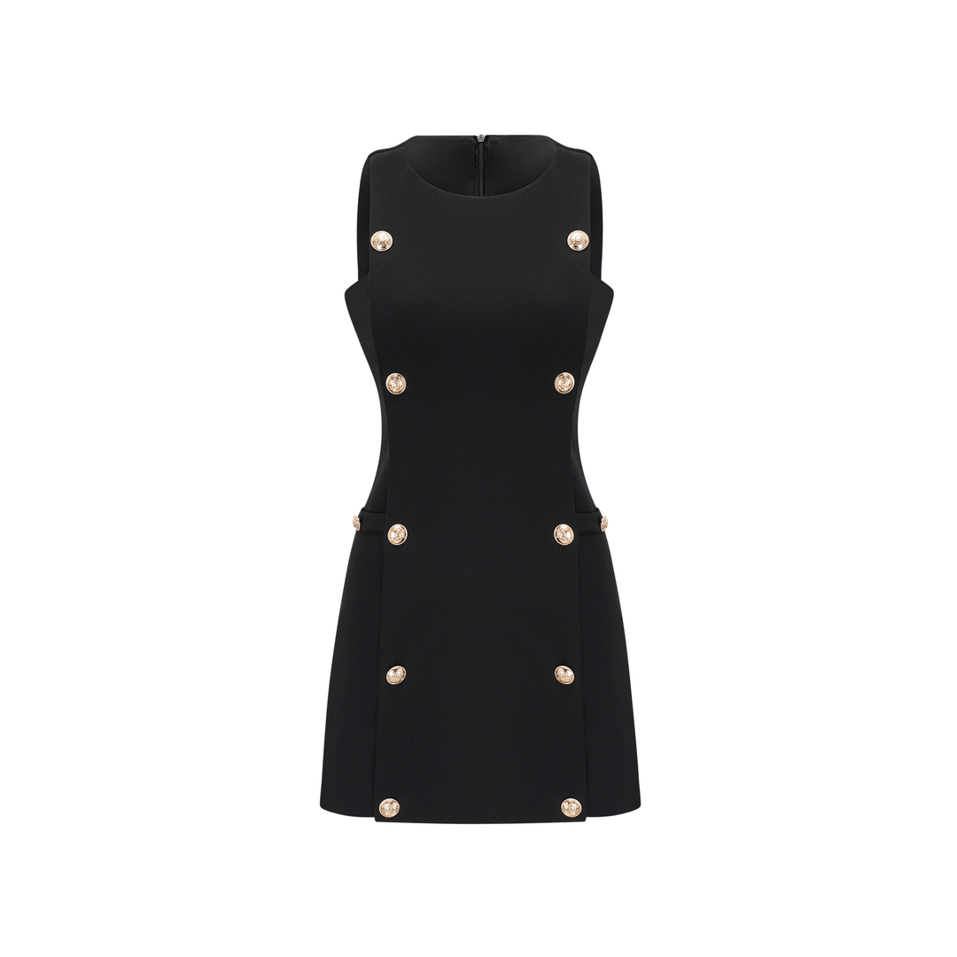 Kaskad Düğme Detaylı Siyah Mini Elbise