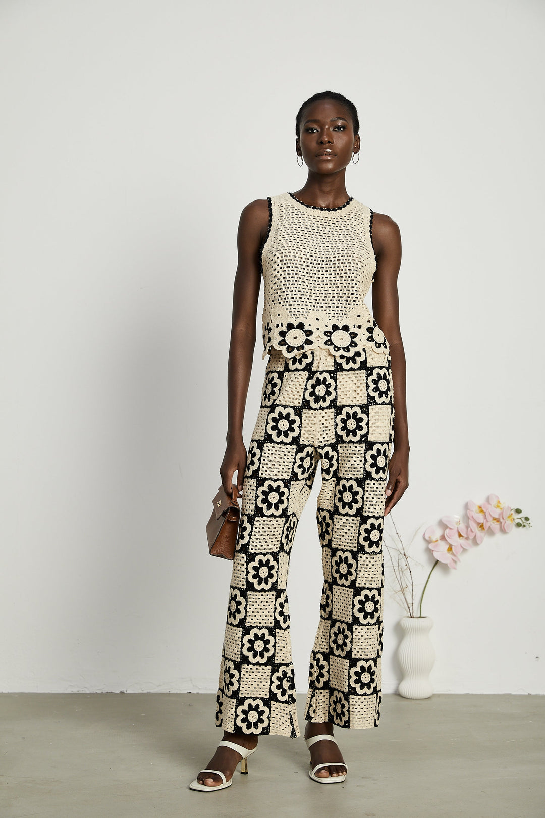 Léna Tığ İşi Çiçek Desenli Üst Ve Pantolon Kombin Seti