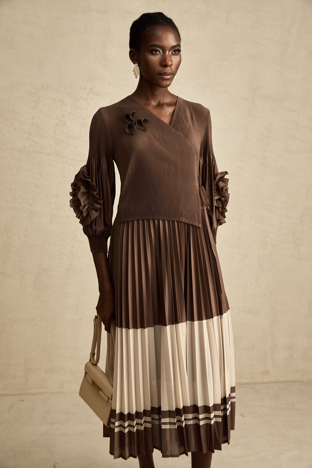 Emeline Kahverengi Suni Çiçek Pilili Midi Elbise