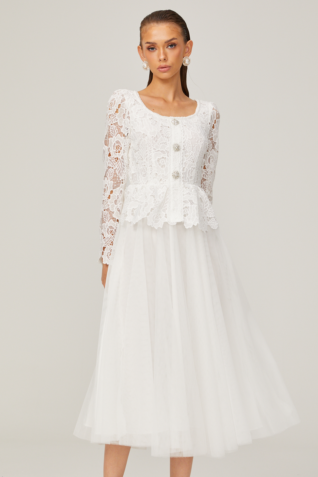 Gabrielle Beyaz Peplum Bel Tül Midi Elbise