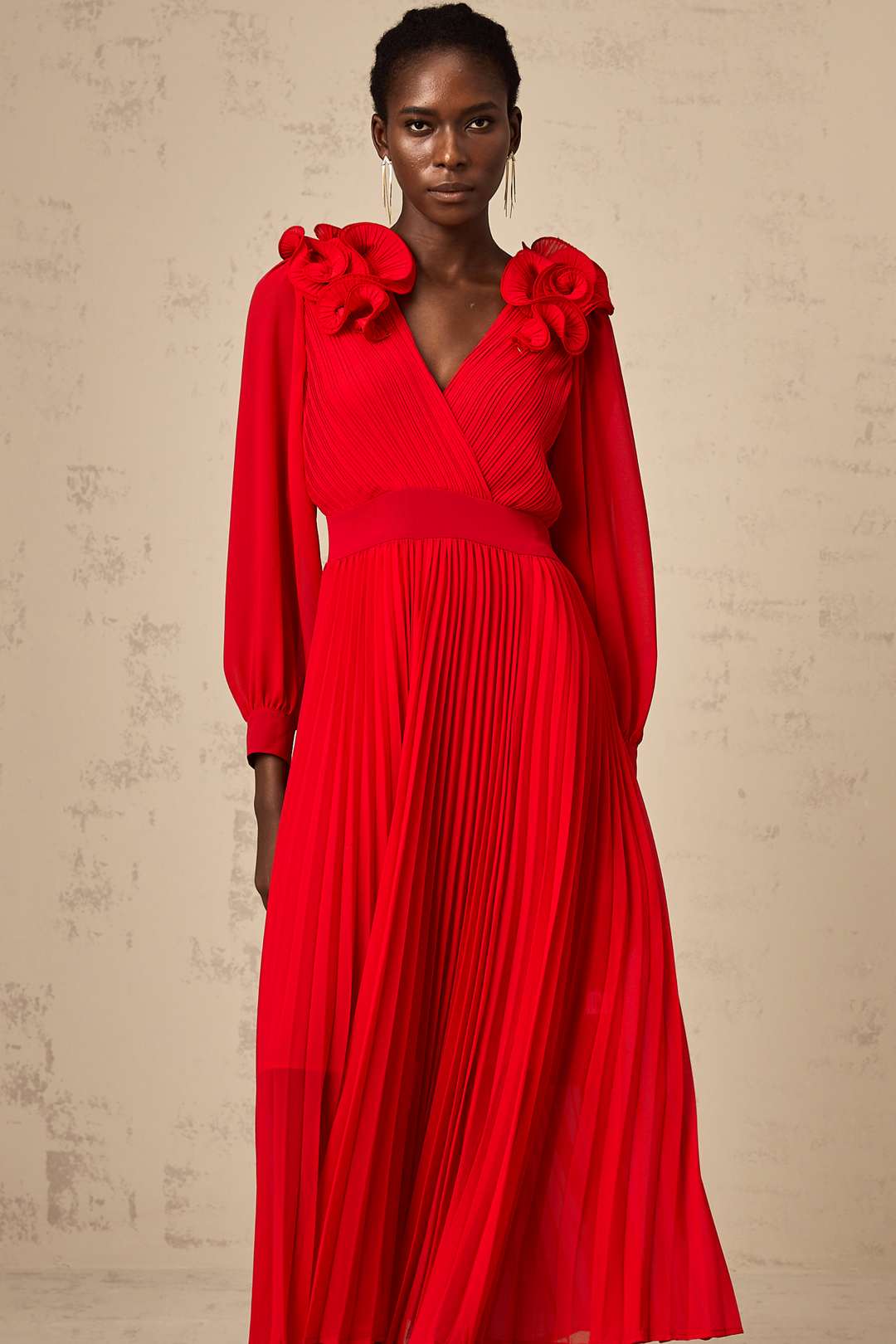Mélina Kırmızı Çiçek Aplikeli Pilili Midi Elbise
