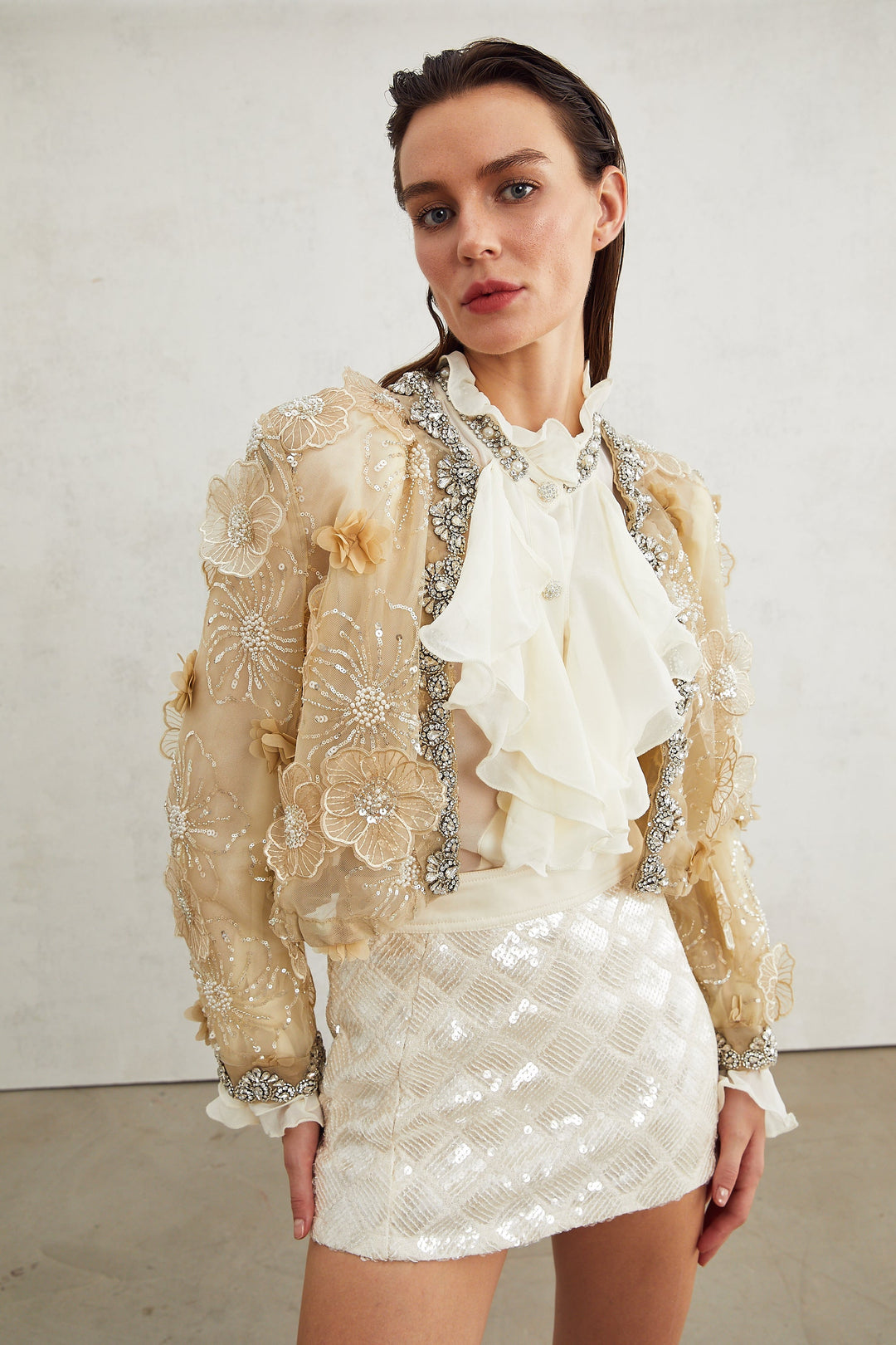 Liane Yarı Şeffaf Çiçek Boncuklu Organze Hafif Lüks Ceket