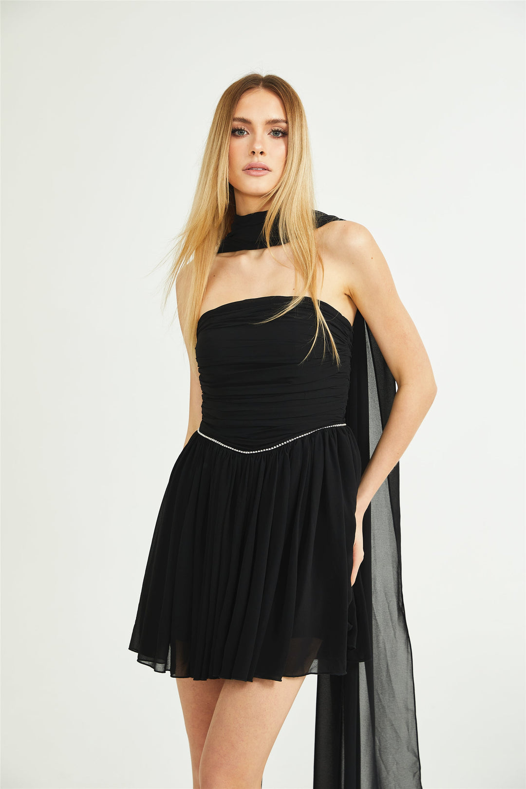Roseline İşlemeli Boyundan Bağlamalı Mini Elbise
