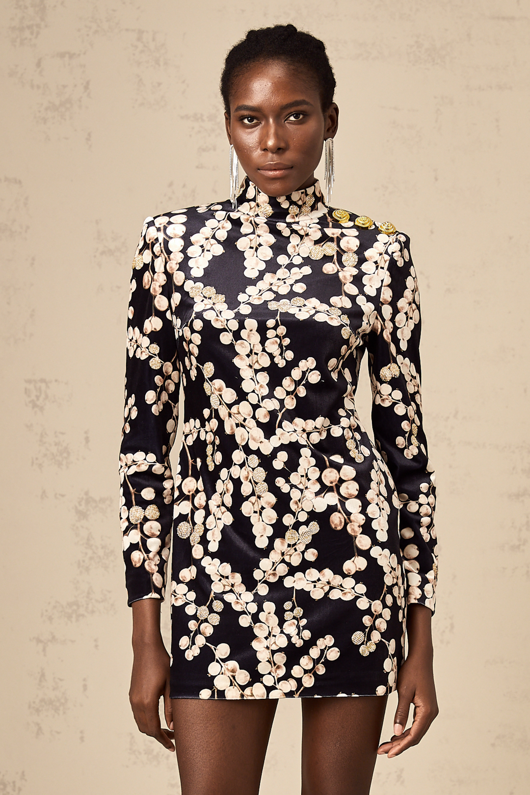 Valeria İşlemeli Grafik Desenli Kadife Mini Elbise