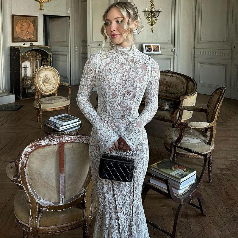 Zarif Yüksek Yaka Dantel Maksi Elbise